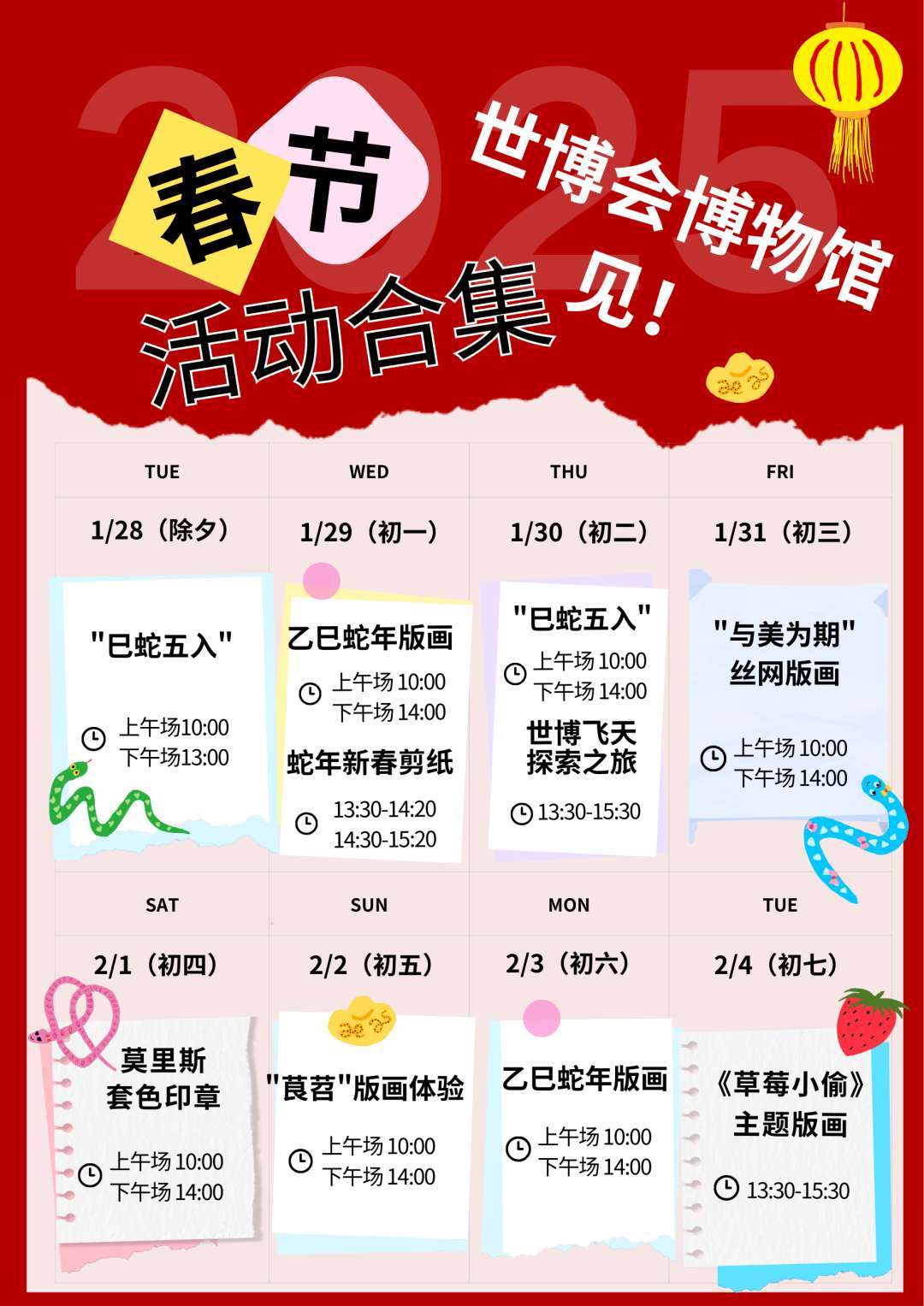 此次展览不仅在展厅中集中呈现了工艺美术运动时期的优秀作品,还在整个场馆中开辟了泛展陈空间,让游客有更丰富的参观体验和回忆。大年初一有乙巳蛇年版画和新春剪纸,大年初二有世博飞天探索之旅,大年初三“与美为期”丝网版画…观众可在此享受丰富的文化体验。