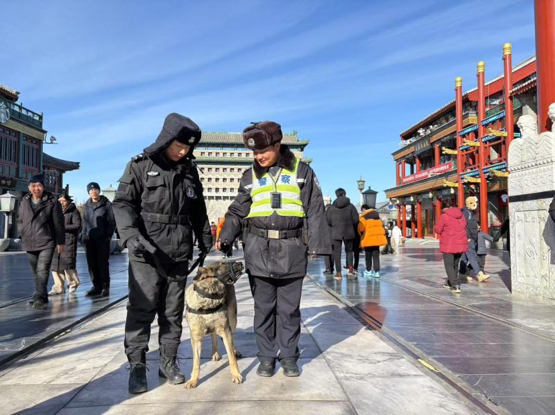 1月28日北京最低气温达-11℃,前门大街上不少游客都穿上厚厚的羽绒服。但“卢卡”从犬舍被带出来时,却显得异常兴奋。“警犬身上有皮毛,能帮它们挡风御寒,因此在这样的寒冷天气里,它们会比人类更有活力。”李嘉威说,相比之下,人类在寒风中执勤就没那么容易了,但为了能让群众在平安中度过新春佳节,他和其他民警仍冒着大风走向了岗位。