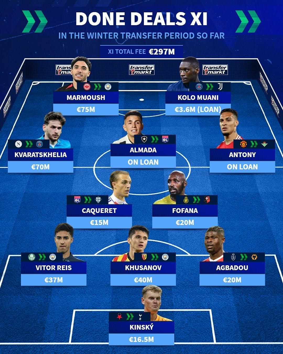 冬窗还有不到一周的时间就将结束,北京时间1月28日,德国转会市场列出了2025年冬窗到目前为止的转会的最佳阵容。