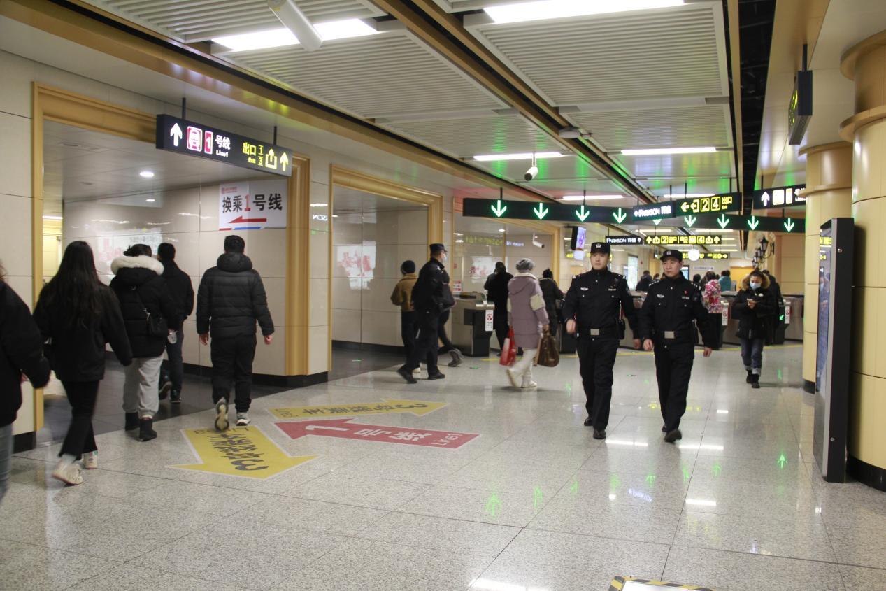 针对春节游客和返乡市民增多的实际情况,市公安局在78座地铁站梯次配备警力,以五座换乘车站为核心区域,依托大数据情指系统,积极建立与各景区联系,提前做好地铁站的乘客吞吐量的评估,实时掌握地铁客流变化,布置警力驻点执勤。通过“警企联动”机制,协调增加车站工作人员,维护站内秩序,保证乘客有序上下车、进出站。同时,配备机动备勤警力,平峰沿线巡逻,如遇客流剧增、暴雪等极端天气,接指令后可快速反应到场增援,形成警力实时调整、实时增援的护航机制。