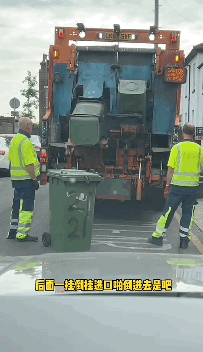 他们的一天,只需要定点到各个垃圾桶边,把垃圾桶拖到卡车后方的机械臂下,