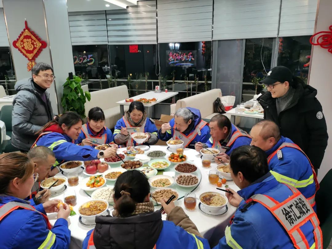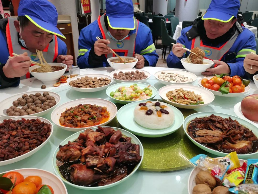 徐汇环卫晶岸分公司党支部书记金春华介绍说,除夕这一天,游客香客比较多,保障任务会一直持续到大年初一的早上。所以年夜饭也分了三组人分别用餐,既要道路上有保洁力量,也能让环卫工人吃上热乎乎的宵夜。虽然说是离开家人,留沪坚守自己的岗位,但是大家心里是暖洋洋的。”
