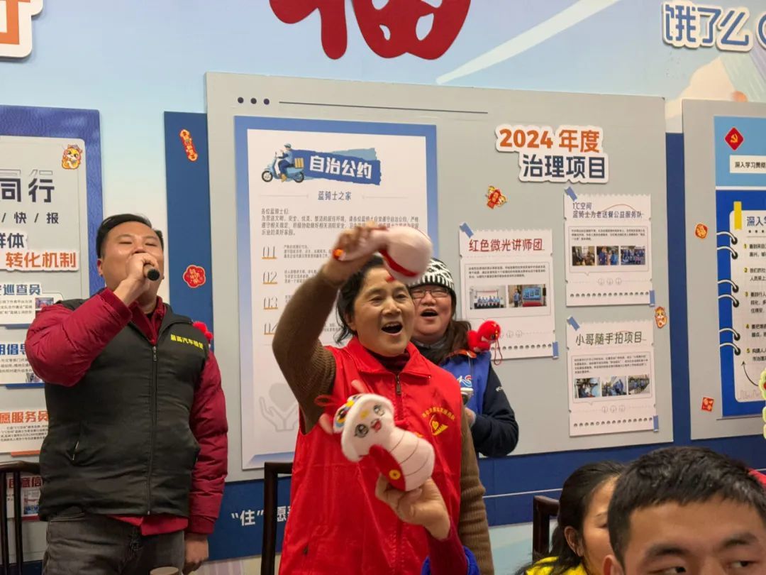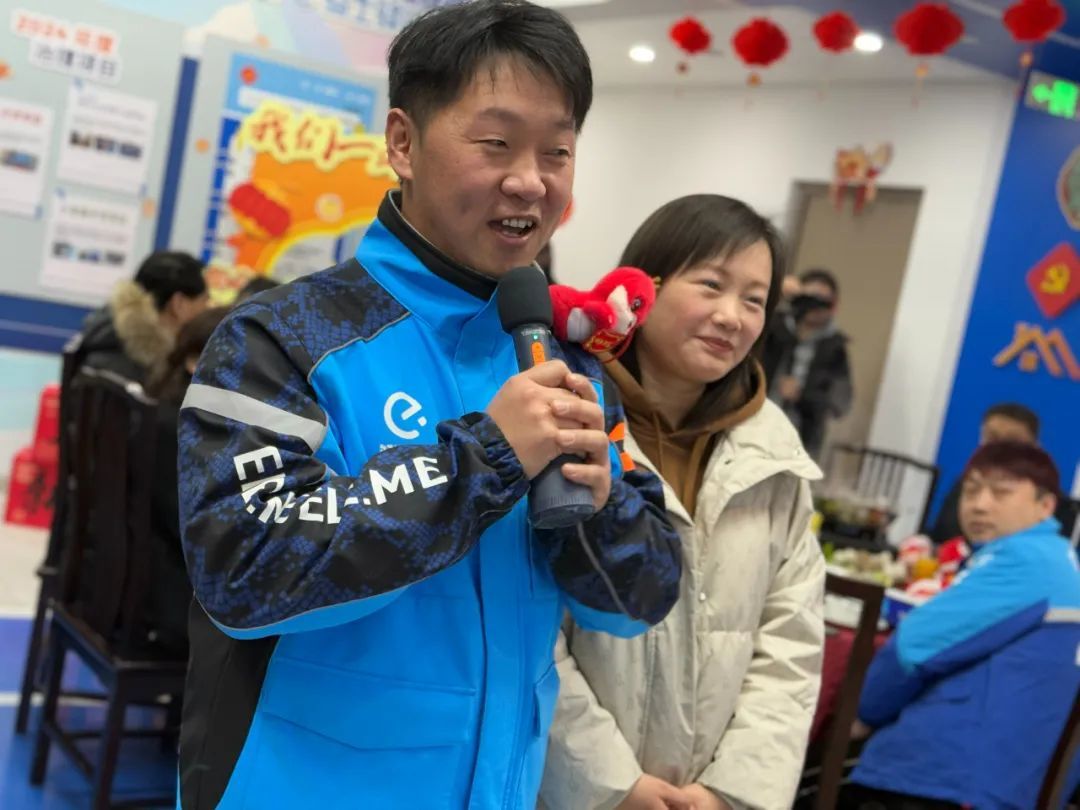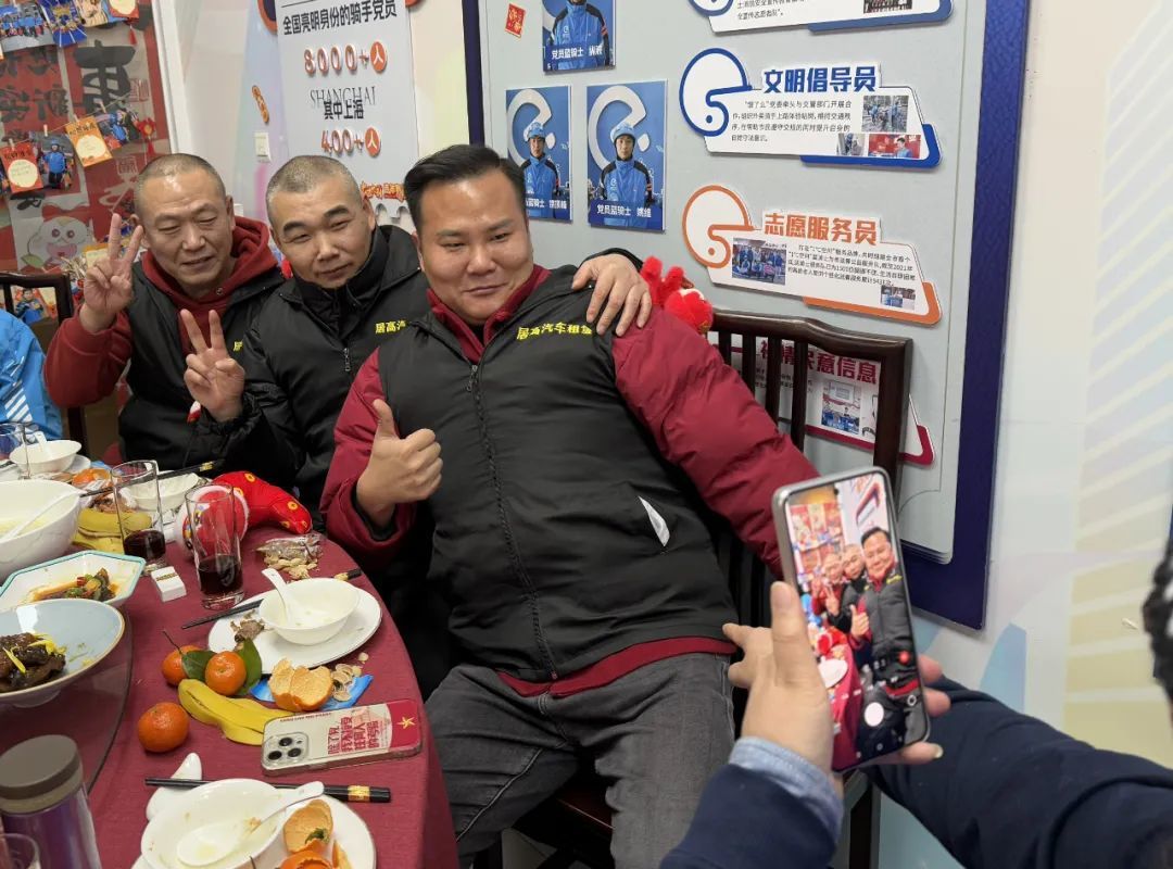 除了丰富的餐食,这场由普陀区委社工部协同区总工会、团区委、区妇联等单位,为各平台留沪过年的新就业群体精心准备的团圆饭,还有表演、慰问、抽奖等环节。有人一起合影,唱歌,也有人把照片与亲人分享。