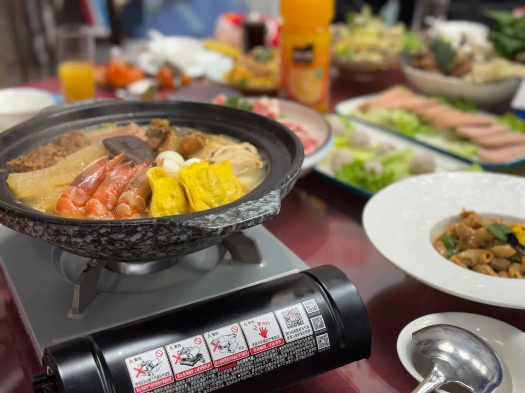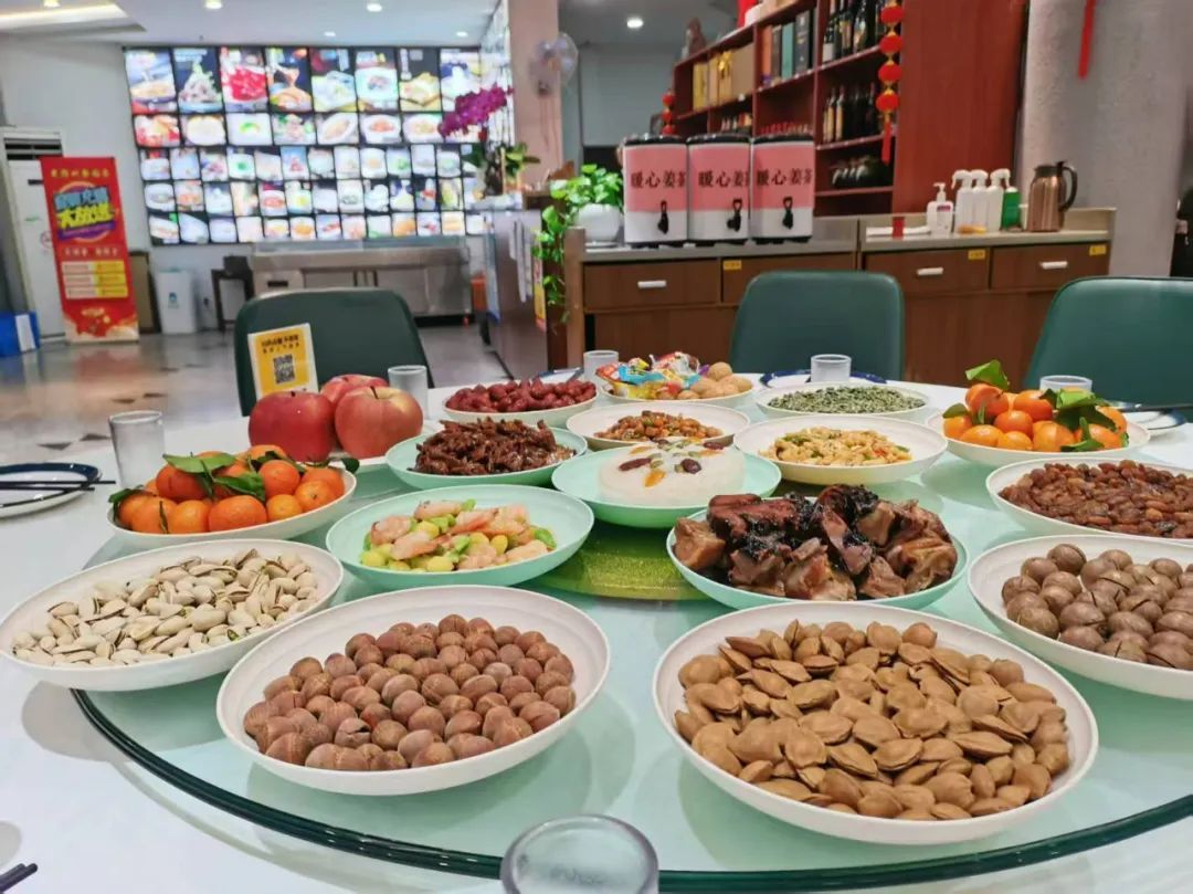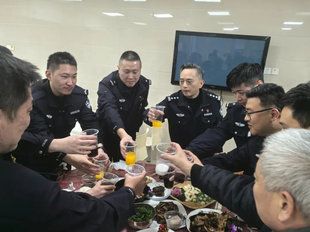 “新年快乐!身体健康!”由于食堂空间有限,只摆得下两张圆桌,再拼起一条长桌,40多名民警、辅警和特保队员围坐在一起,吃上一顿热闹的集体年夜饭。大厨葛军军说,他们提前两天就开始备菜了,让民警们在所里也能感受到浓浓年味。