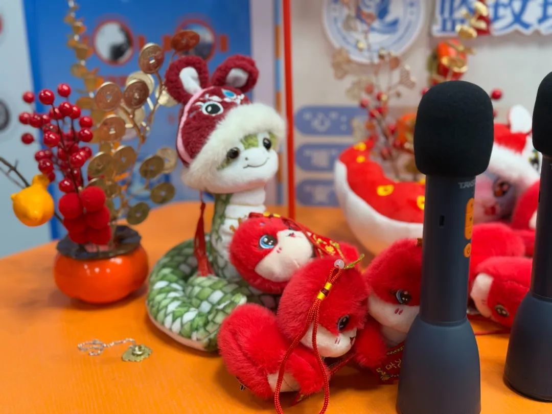 除夕夜,普陀区新时代城市建设者管理者之家和欣公寓里洋溢着十足的年味:大红福字贴满了半面墙,蛇年吉祥物布置在大堂各个角落。