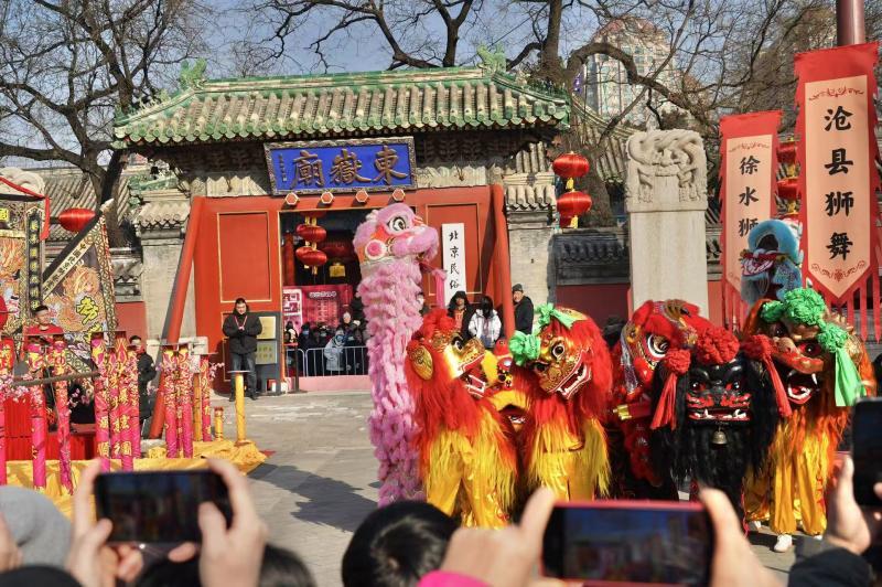 狮子被认为是驱邪避害的吉祥物,每逢节庆民间都会有舞狮助兴,这一传统习俗代代相传。今年东岳庙庙会现场,群狮亮相,威风凛凛、活灵活现,南狮表演淋漓尽致地展现了狮子昂扬威猛的形象,北狮表演栩栩如生地演绎出狮子的生活习性和“憨态可掬”的俏皮形象,将现场气氛调动得热闹非常,在场观众也被南北舞狮表演所感染,争相与面前几只萌趣又传统的瑞兽合影互动。