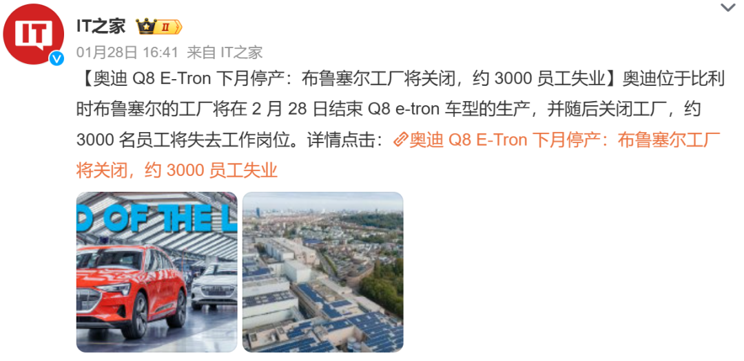 据外媒报道,奥迪位于布鲁塞尔的工厂即将于2月底关闭,届时约3000名员工将失去工作岗位。同时,奥迪Q8 e-tron将在2月底停产,最后一辆Q8 e-tron计划于2月28日下线。