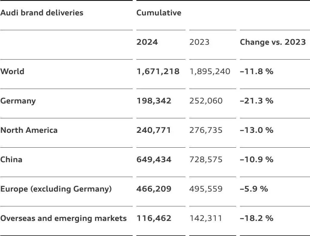 数据显示,2024年奥迪全球累计销量为167.12万辆,同比下滑11.8%,而在细分市场中,包括中国市场在内的主要市场销量均出现不同程度的跌幅。其中,奥迪中国市场累计销量为64.9万辆,同比下滑10.9%;德国市场销量为19.83万辆,同比下滑21.3%;北美市场销量为24.07万辆,同比下滑13%;欧洲(不包括德国)市场销量为46.62万辆,同比下滑5.9%;海外和新兴市场销量为11.65万辆,同比下滑18.2%。针对全球销量的下滑,奥迪表示销量下滑的原因包括严峻的经济形势、激烈的市场竞争以及零部件供应有限。值得一提的是,尽管前景并不乐观,奥迪集团仍表示正在更新其产品阵容。
