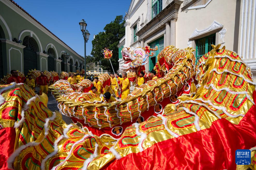 新华社澳门1月29日电(记者李寒芳、郭雨祺)摸摸闪亮的“金龙”鳞片,领上金光灿灿的“元宝”,和财神爷一起比手势自拍……大年初一的上午,澳门传统地标大三巴再度成为欢乐的海洋,传统节目金龙醒狮雄赳赳巡城,所到之处欢腾一片。