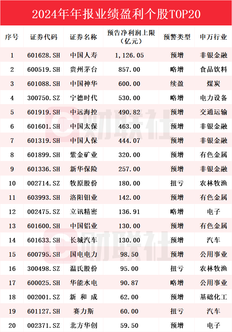 其中,中国人寿、贵州茅台、中国神华、宁德时代、中远海控、中国太保、中国人保、紫金矿业、新华保险、牧原股份、洛阳钼业、立讯精密、中国铝业、长城汽车、国电电力、温氏股份、华能水电、新和成、赛力斯和北方华创预计2024年净利润均超百亿。具体情况如下图: