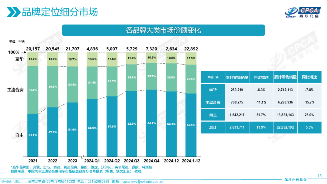 乘联会数据显示,2024年国内乘用车市场零售销量为2289.2万辆,同比下滑5.5%。其中,自主品牌销量为1385.1万辆,同比增长23%;主流合资品牌销量为629.9万辆,同比下滑15.7%;豪华品牌销量为274.2万辆,同比下滑7.8%;在合资品牌中,德系品牌销量为404.0万辆,同比下滑9.0%,占市场份额17.6%,日系品牌为313.4万辆,同比下滑15.2%,占市场份额13.7%。此外,法系销量下滑20.8%,韩系下滑28.0%,美系下滑18.0%,一众合资品牌基本呈现下滑的状态。