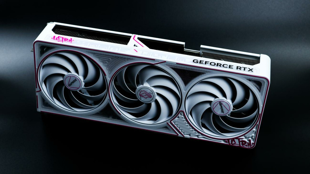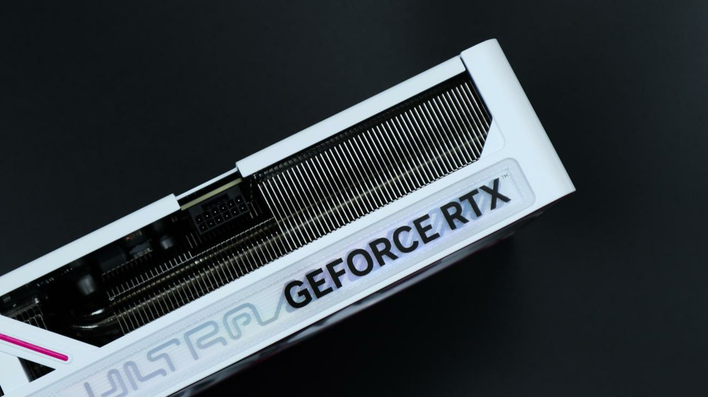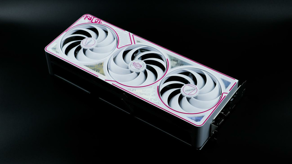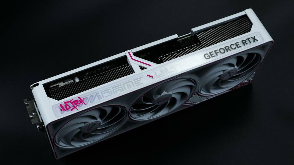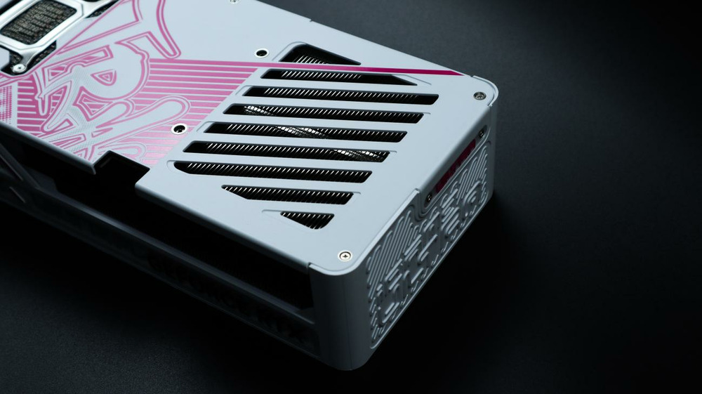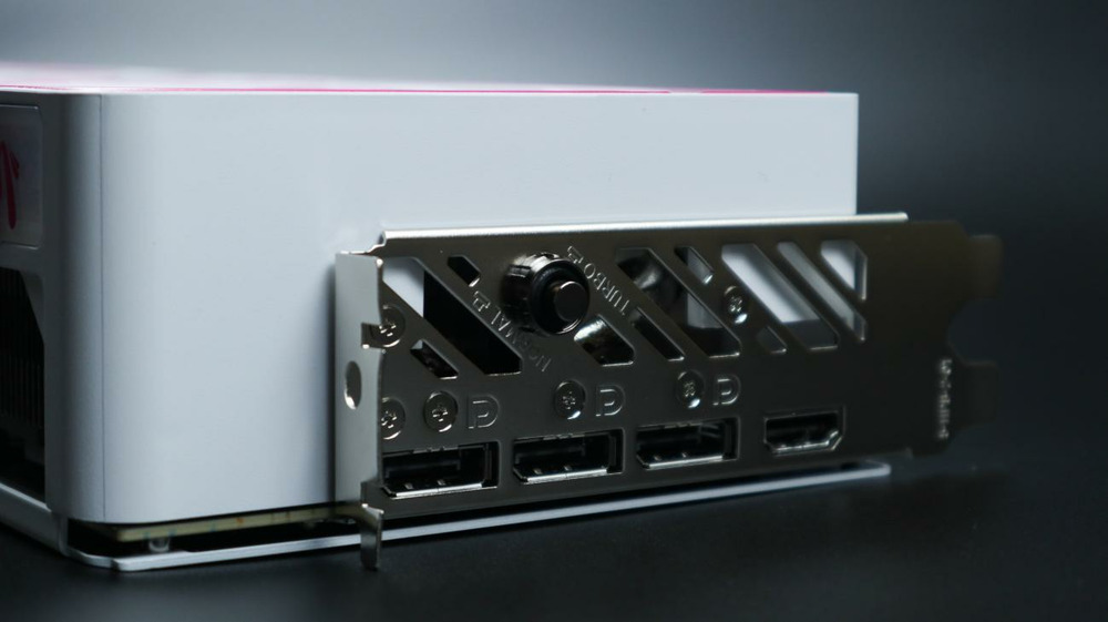 显卡背板也采用白色涂装,同时采用金属材质,粉色的“Ultra”涂鸦字体几乎覆盖了整个背板,在背板上部也做了开孔的镂空处理以增加散热风道,使得散热更强。