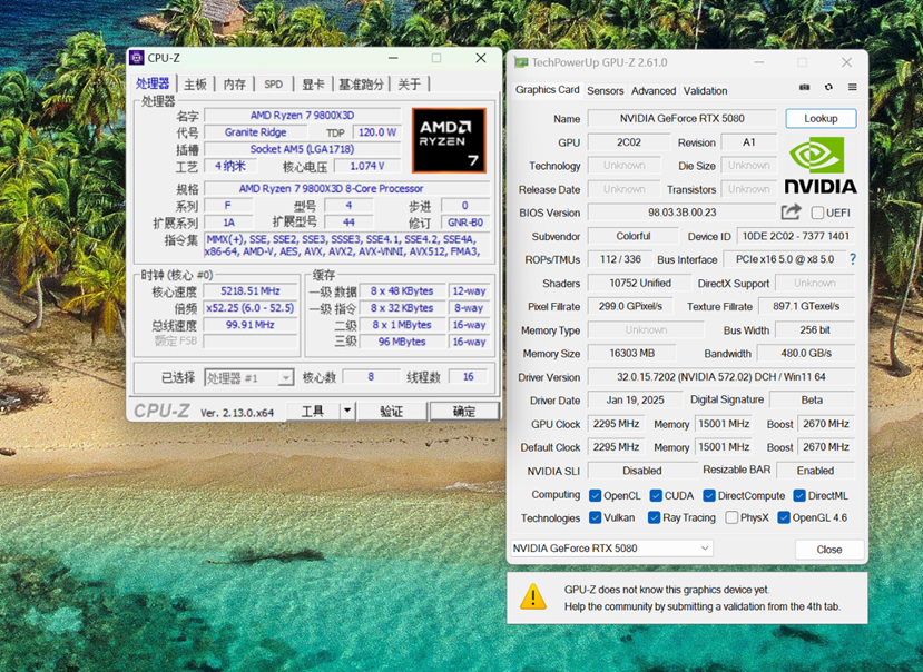 测试配置方面,我们使用了锐龙7 9800X3D处理器+X870E HERO主板的组合,在测试时使用的GPU-Z软件版本尚不适配RTX 50系显卡,因此无法读取到部分信息。