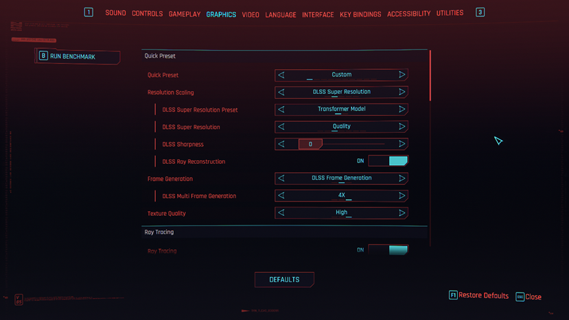 在《赛博朋克2077》实机体验中,由于我们此前已经在RTX 5090 D上感受了DLSS性能档位+多帧生成4x模式的突出性能表现,因此提升了一些画质要求。画质预设依然使用4K分辨率、光线追踪-超速,DLSS调整至原生渲染分辨率接近1440P级别的质量档位,同样开启多帧生成这个DLSS 4核心功能至4x模式。
