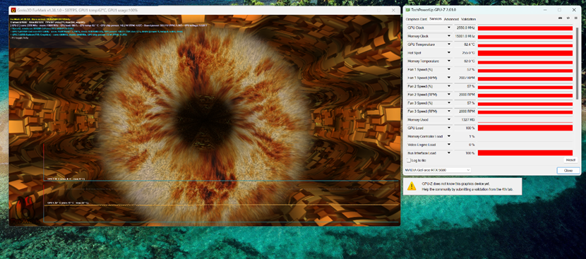 我们也使用FurMark进行了显卡单烤测试,正如此前在RTX 5090 D上见到的情况,热点温度显示为固定的255℃,可能意味着RTX 50系去掉了热点温度传感器,或者对热点温度有了新的定义,暂时无法被软件读取。