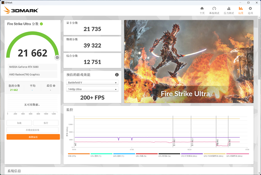 在测试DX11性能的Fire Strike Ultra中,iGame RTX 5080 Advanced OC显卡得分21735。