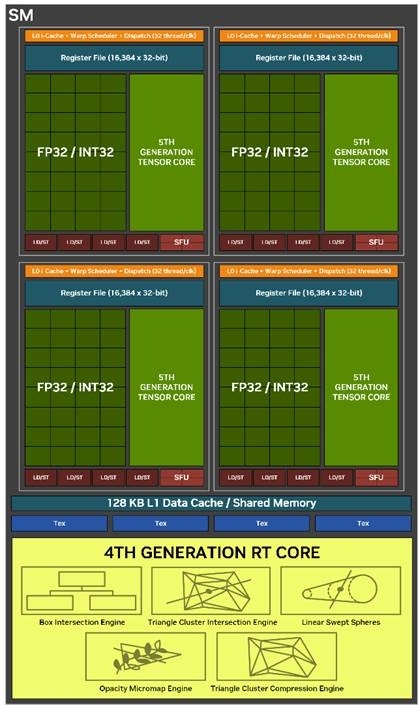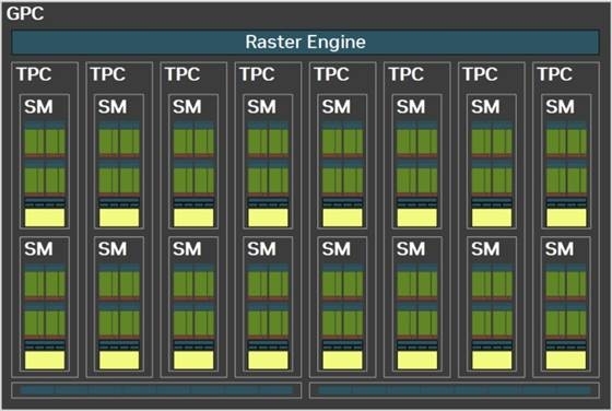 从这张Blackwell架构的GPC示意图中我们可以看出,本代1个完整GPC含有1个光栅引擎(Raster Engine),共8组TPC中各包含2个多单元流处理器,以及最下方的两组各8个光栅单元。相比上代架构,单个GPC的规格有所扩充。