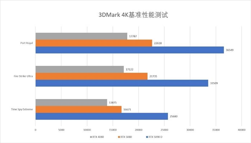 我们也将这三项分数汇总在图表中,与前代同级别产品RTX 4080、本代旗舰产品RTX 5090 D进行对比。