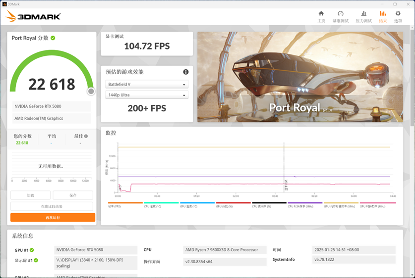 在测试光线追踪性能的Port Royal中,iGame RTX 5080 Advanced OC显卡得分22618。