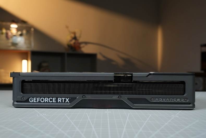 正面的半透磨砂黑外甲部分延伸至侧面板,非竖装时同样能为玩家带来出色光效体验。上部可见12V-2x6供电接口与灯效同步接口。