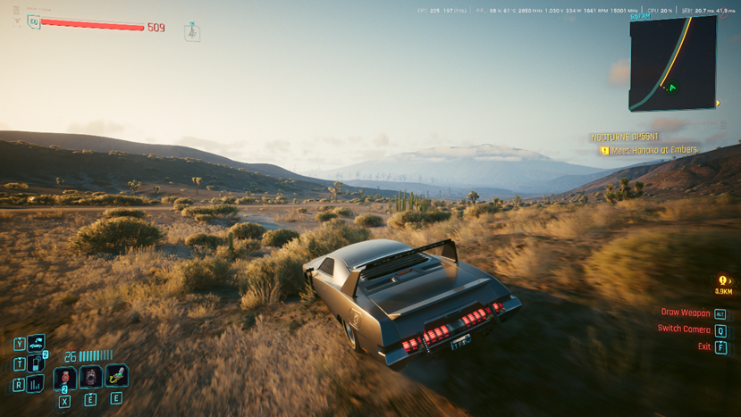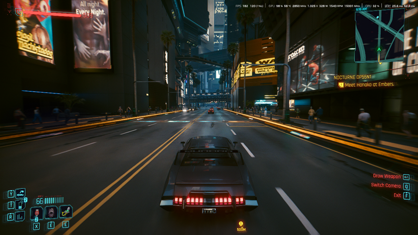 在环境元素更加复杂的夜之城场景中,平均帧与1%Low帧表现均有所下降,但同样能够保证流畅游玩需求,游戏延迟表现也有良好控制,没有出现操作不跟手的情况。