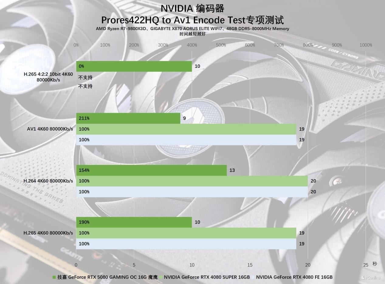 在Adobe以及达芬奇的Benchmark测试里,GeForce RTX 5080整体相比RTX 4080或RTX 4080 SUPER也有小幅提升,不过提升比较大的还是视频编辑部分,究其原因还是因为这一代RTX 5080再度对编码器进行了升级,不仅编解码的效率更高,同时支持的格式也更丰富。