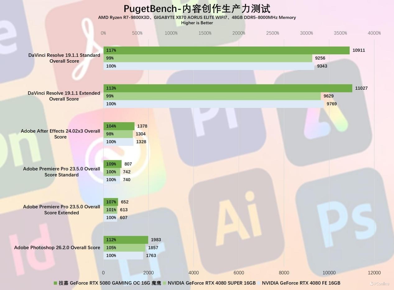 例如在达芬奇和PR的测试中,技嘉RTX 5080魔鹰显卡领先RTX 4080约7%~17%,还是非常夸张的。同时在PS以及AE里也有小幅的性能提升,大约在4%~12%之间,总体来说就是内容创作的效率更高了。