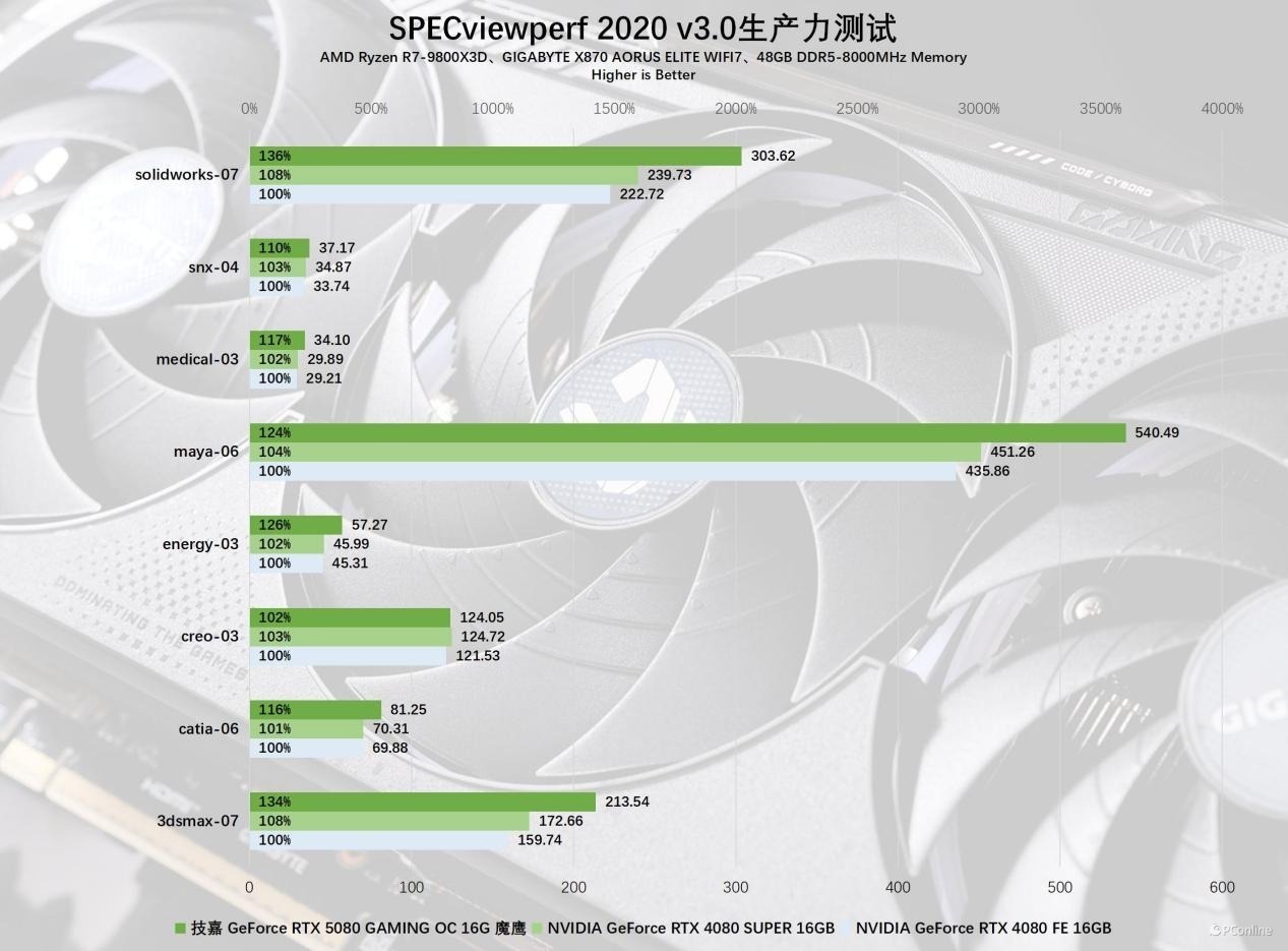 再看看工业领域的表现,SPEC2020能够反映显卡的工业能力,在多项测试中技嘉RTX 5080魔鹰显卡依旧傲视群雄,对比RTX 4080平均有30%的提升,而对比RTX 4080 SUPER也在25%左右,这个性能提升还是很可观的,甚至有些超乎想象。