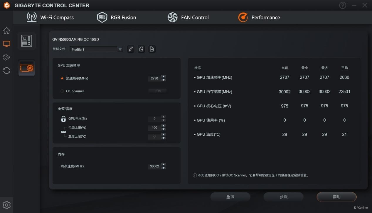 至于性能页面更是可以对技嘉RTX 5080魔鹰显卡进行核心Boost频率、GPU电压、电源上限、温度上限,以及显存频率的设定,方便大家对显卡进行超频。当然普通玩家更是可以通过OC Scanner扫描进行自动超频,以及获得更好的显卡性能表现。