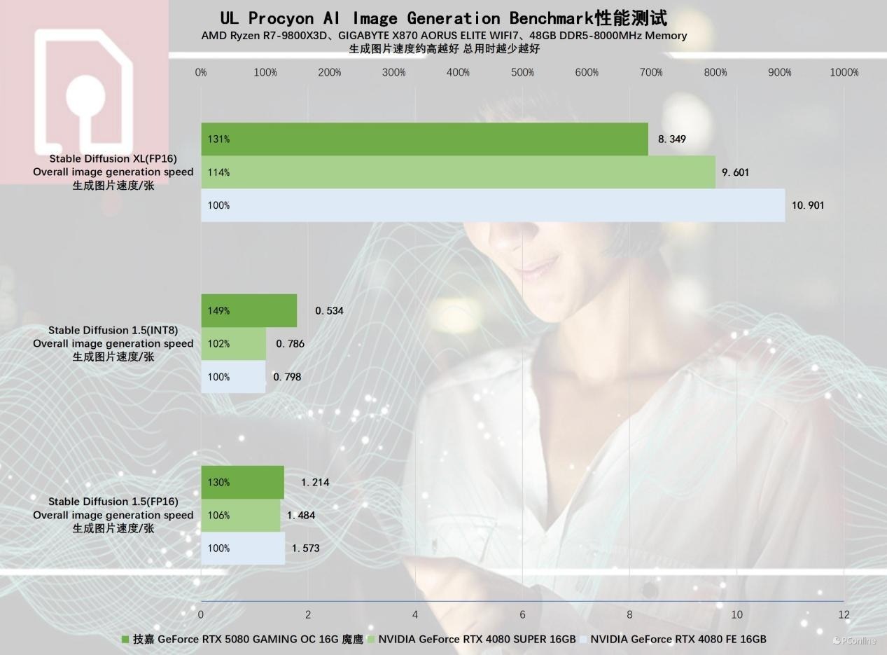 再看看GeForce RTX 5080在Stable Diffusion中的表现如何,还是用UL Procyon进行测试,在比较轻松的SD 1.5文生图测试里,无论是采用FP16精度模型还是INT8精度模型,RTX 5080的表现都展现了旗舰级显卡应有的实力,特别是在INT8精度下,生成一张图的速度仅需0.54秒,效率比上代显卡快了48%,已经接近一倍了。而即便是在压力比较大的SDXL中,优势也非常明显,生成一张图的速度为8.439秒,同样领先RTX 4080或RTX 4080 SUPER达1~2秒。