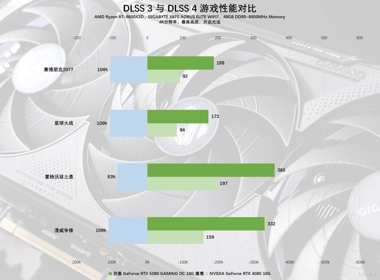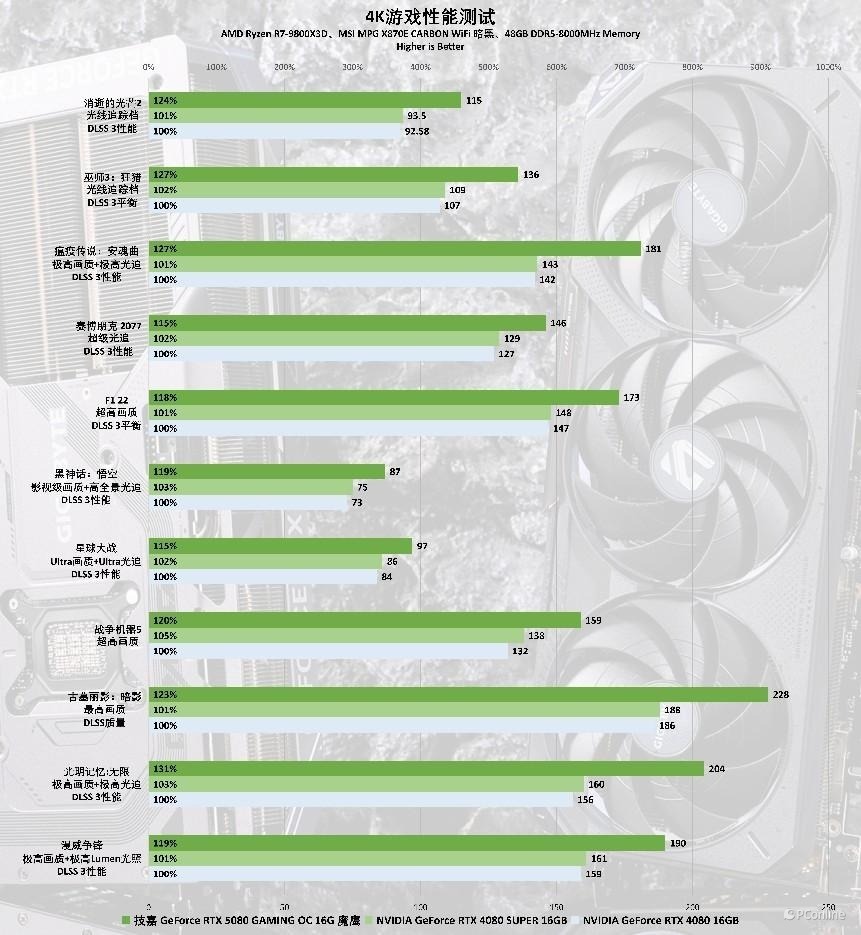 在实际测试中,技嘉RTX 5080魔鹰显卡在4K分辨率下轻松应对了大多数游戏,尤其是在DLSS技术的加持下,实现4K@144Hz的电竞体验毫无压力。即便是将《黑神话:悟空》的设置调至全高,这款显卡仍能提供87 FPS的流畅体验,几乎触及了高刷新率的极限。可以预见,随着DLSS技术的进一步升级,帧数的提升将更为显著。在性能对比方面,技嘉RTX 5080魔鹰显卡在众多游戏中表现出色,相较于RTX 4080 SUPER,其性能大约高出20%,而与RTX 4080相比,性能领先幅度更是可以达到25%以上。