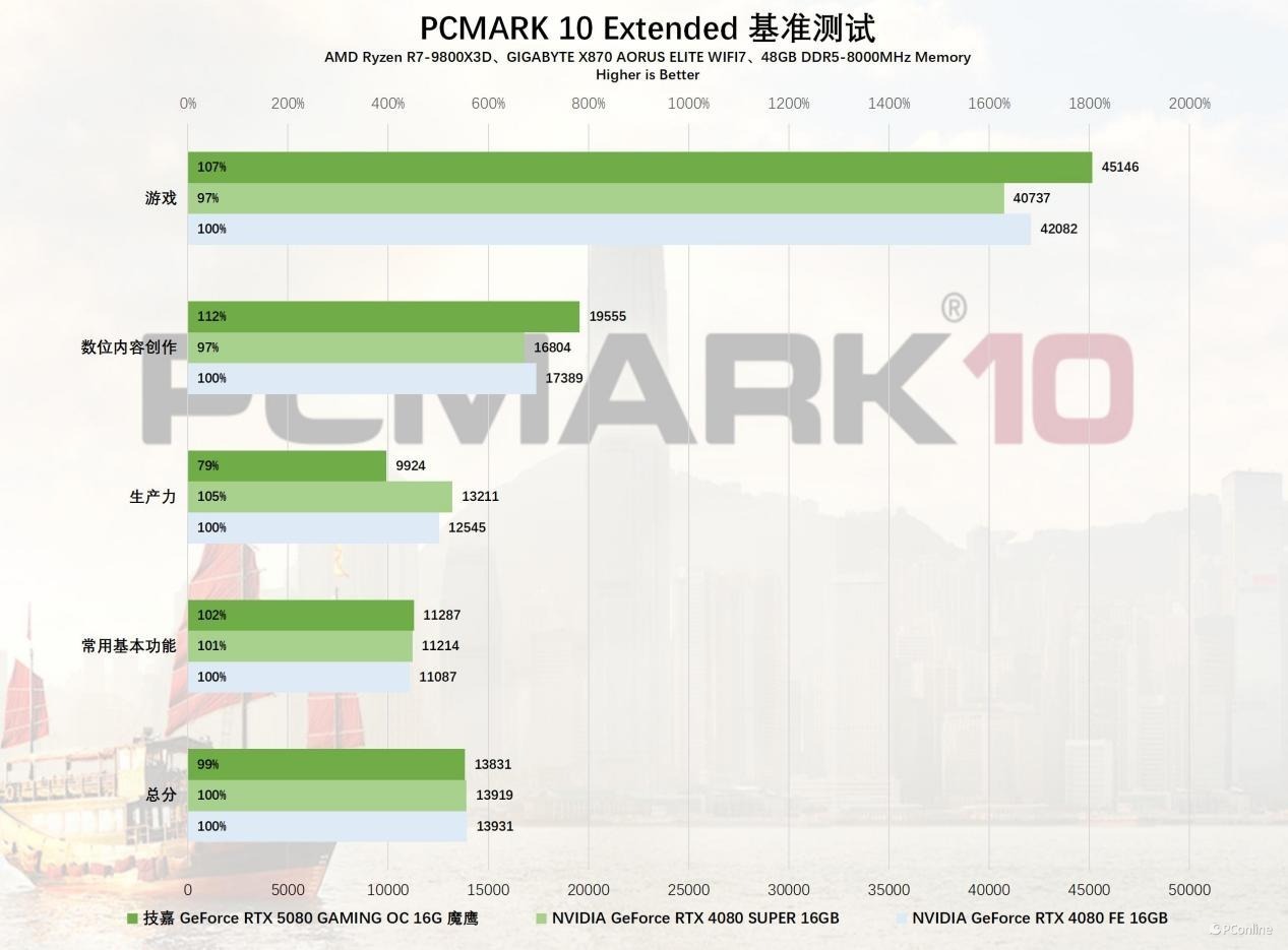 游戏测试完成后,接下来让我们关注创作者们所关心的生产力性能。在PCMark10 Extended测试中,技嘉RTX 5080魔鹰显卡在游戏和数字内容创作方面的表现更为出色,相较于RTX 4080,其性能提升了大约7%和12%。然而,在生产力测试方面,成绩略显逊色,这可能是因为当前驱动程序尚未完全优化。