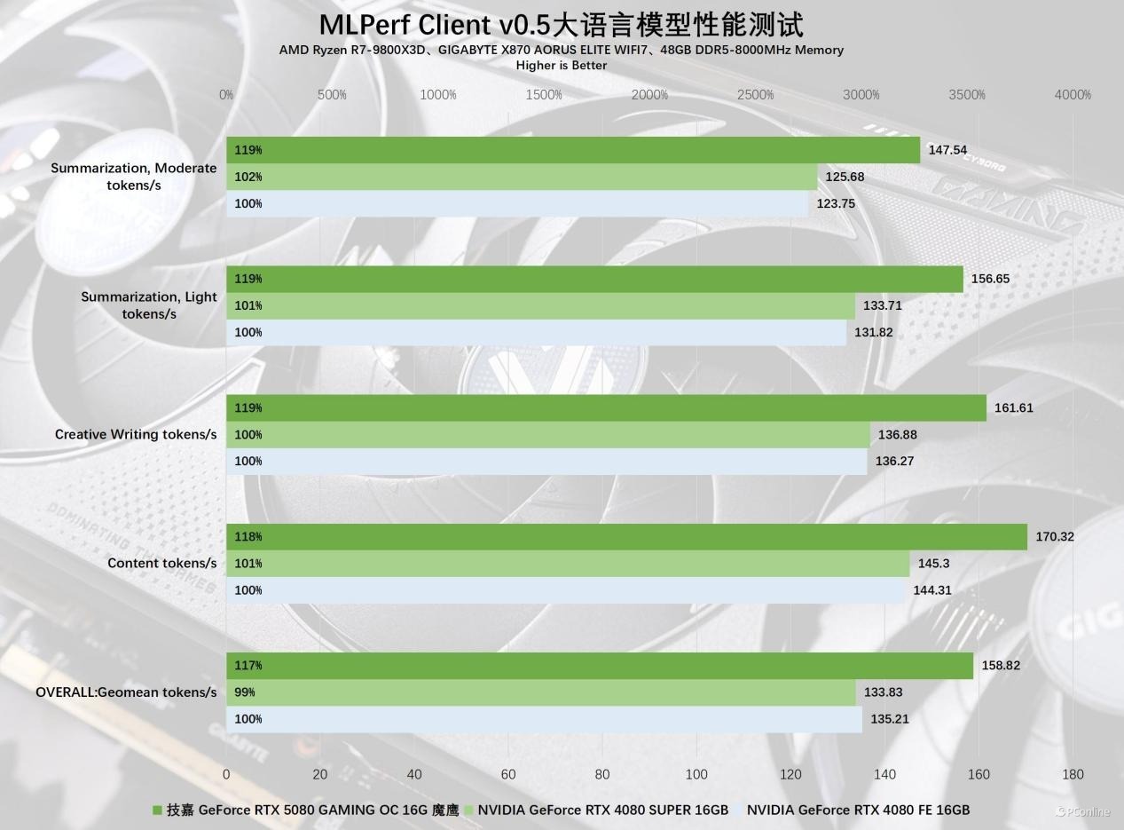 在AI文本生成测试中,技嘉RTX 5080魔鹰显卡在一众大语言模型里同样表现出众,我们用MLPerf Client v0.5大语言模型进行测试,它是基于meta的Llama 2 7B开源LLM打造,涵盖了四项AI任务,分别是内容生成、创意写作以及对两份不同长度文本进行总结摘要。实测技嘉RTX 5080魔鹰显卡在每一项中都表现出了绝对的统治力,各项领先幅度均在17%~19%左右。
