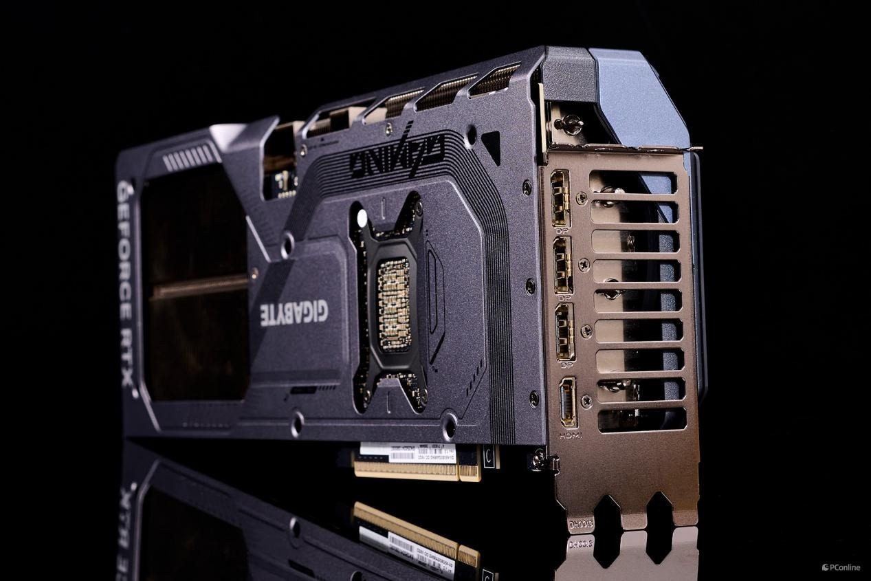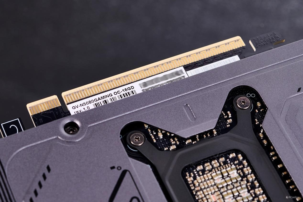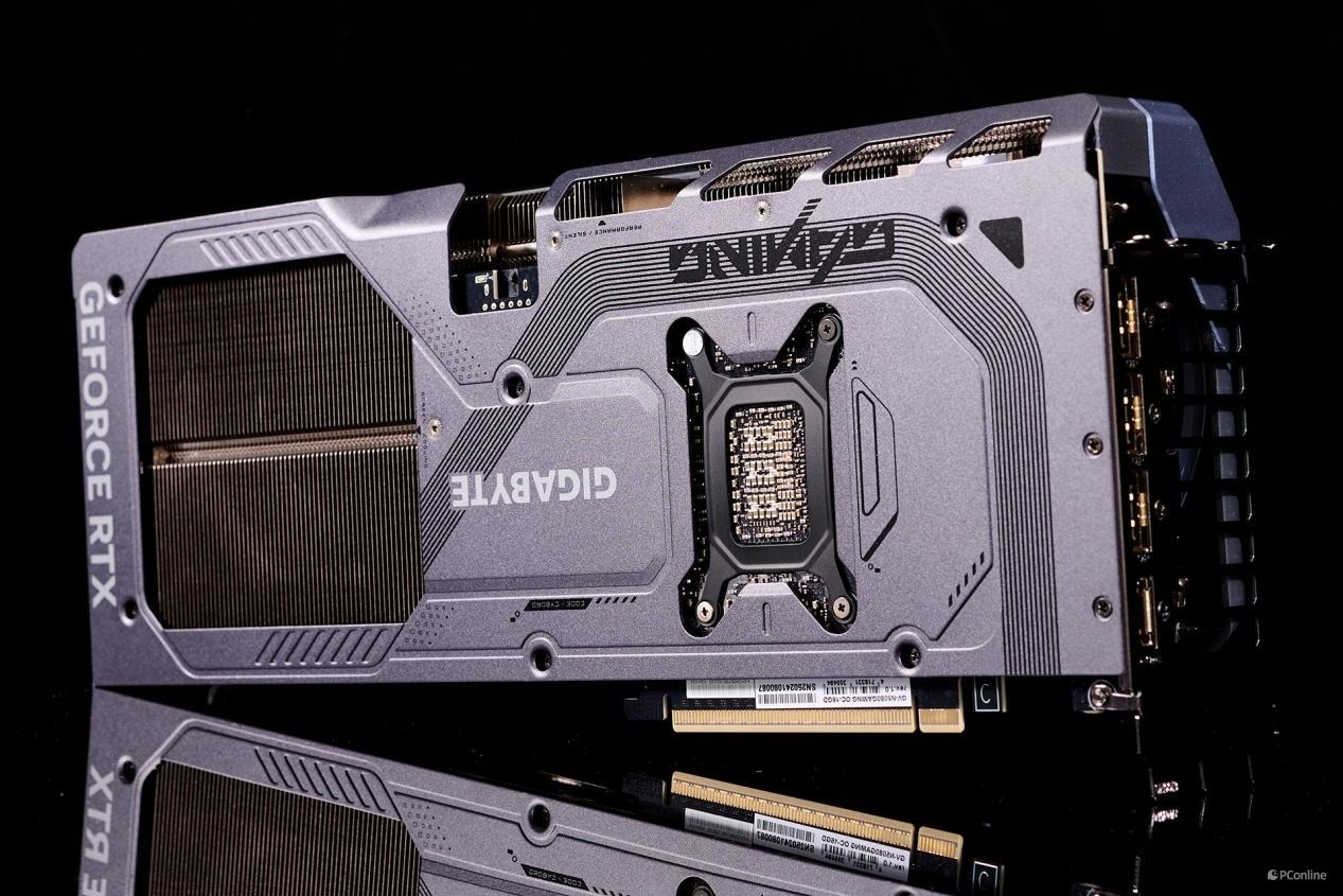同时,技嘉RTX 5080魔鹰显卡的背面延续了尾部的贯穿式通风设计,拥有大面积的开孔,使得风扇可以直接吹透散热器主体,从而增强散热效果。