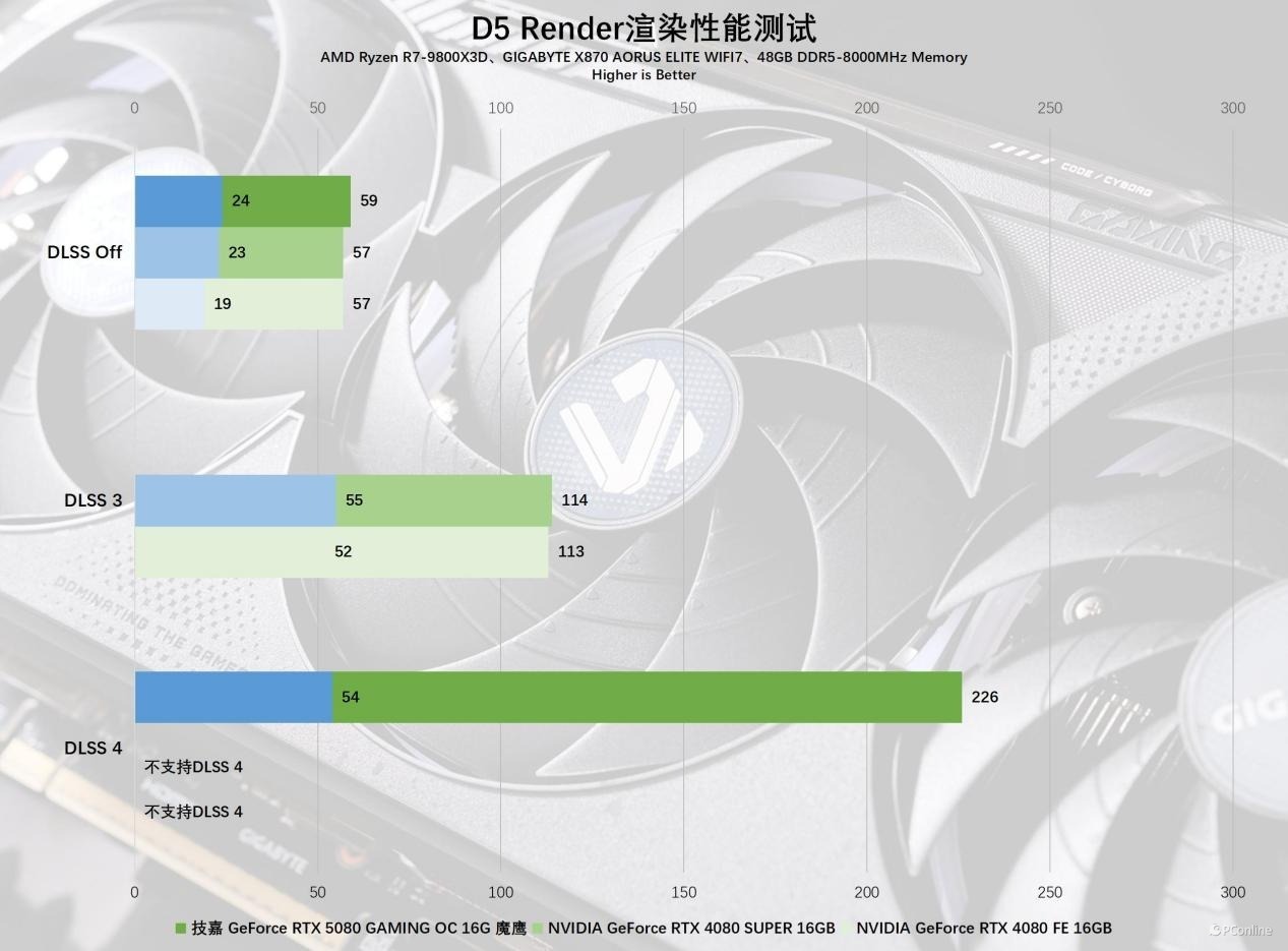实测技嘉RTX 5080魔鹰显卡在开启DLSS 4以后,整个渲染预览的界面变得丝滑流畅,帧数基本在226 FPS附近,而对比不开DLSS时,仅59 FPS的表现来看,性能几乎是提升了4倍以上。即便是面对RTX 40系的DLSS 3,也一点不虚,性能优势也有50%以上。