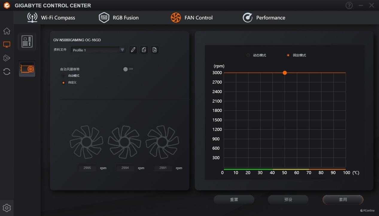 技嘉RTX 5080魔鹰显卡自带风扇启停技术,可以自定义风扇转速,以及关闭风扇启停。