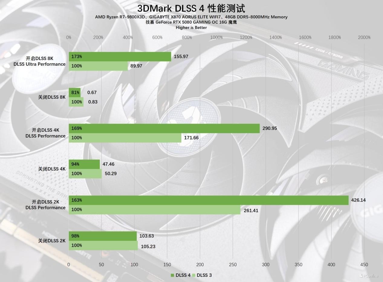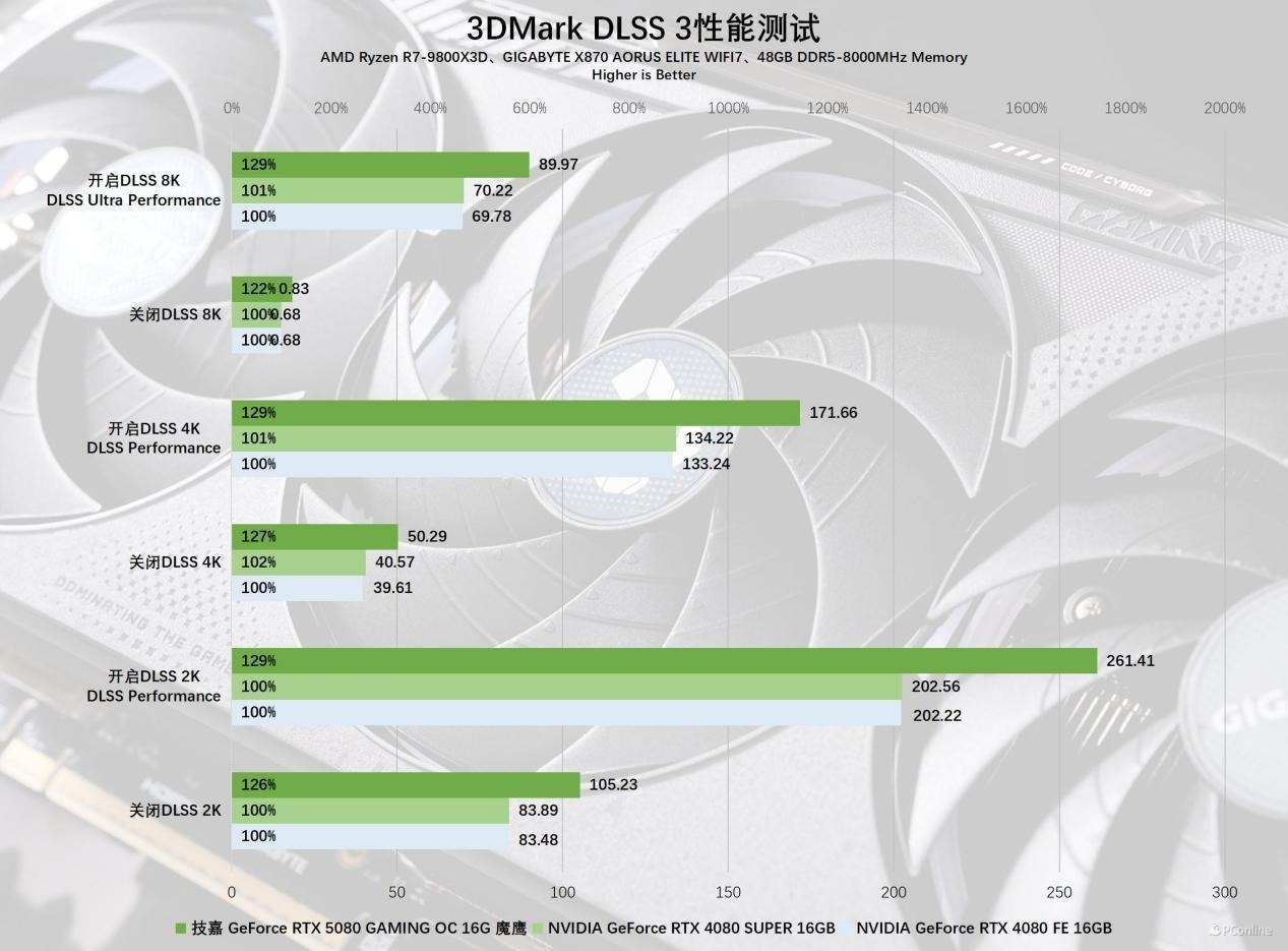 简单介绍完,我们再看看DLSS 4的理论表现如何,还是经典的3DMark测试。不得不说技嘉RTX 5080魔鹰显卡搭配上DLSS 4有如神助,帧数再度实现了飞跃!