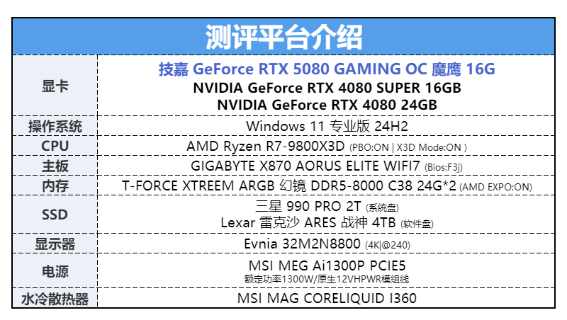 当然理论性能终归是纸上谈兵,还得进游戏里实际测试一下才知道技嘉RTX 5080魔鹰显卡的实力。这里我们选取了11款游戏进行测试,包含光追及光栅性能方面的测试,而游戏画质方面均全部选择最高画质,光追设定部分,如有则采用最高。