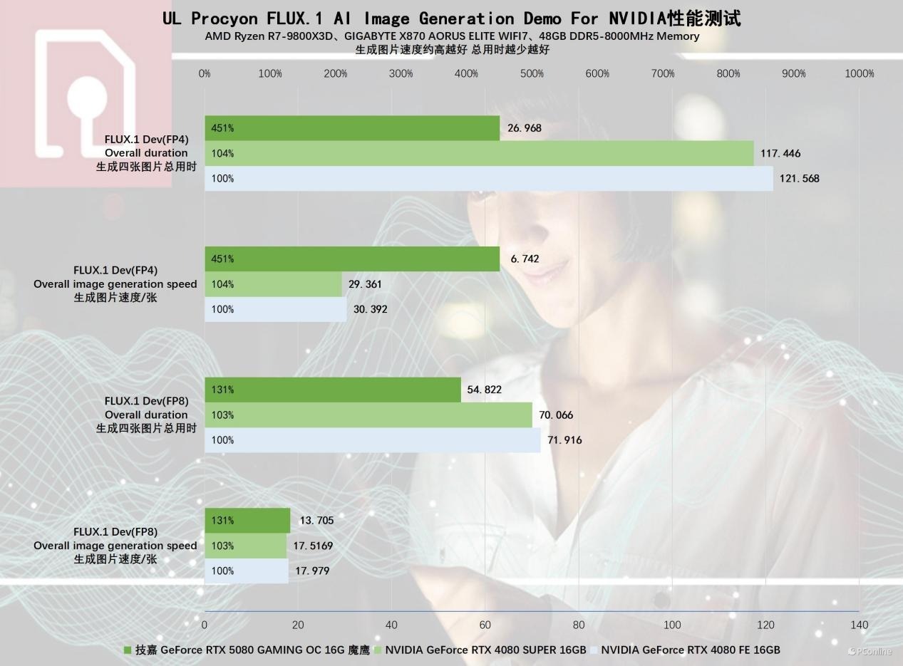 不信你看,我们用UL Procyon的FLUX.1 AI Image Generation Demo For NVIDIA进行测试。在均使用FP8精度模型时,技嘉RTX 5080魔鹰显卡能够做到13.705s生成一张图,而RTX 4080或RTX 4080 SUPER则要17秒以上;而切换到FP4精度模型后,速度才真正拉开了差距,其中技嘉RTX 5080魔鹰显卡生成图片的速度能够提升到6.742秒一张,效率翻了一倍不止。而RTX 4080或RTX 4080 SUPER的生成时间则不降反升,RTX 5080对比它们的性能,拉大到了3.5倍以上。