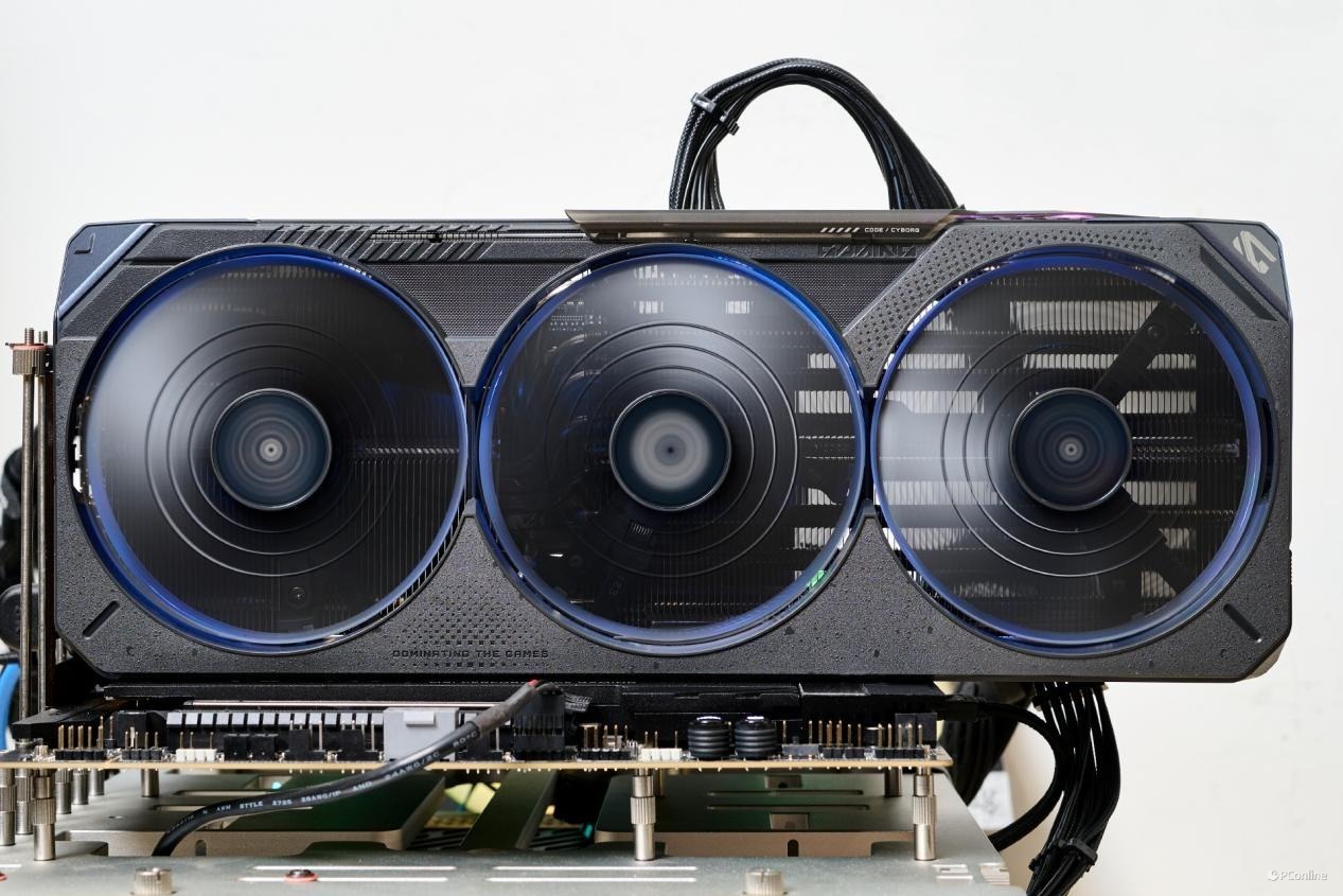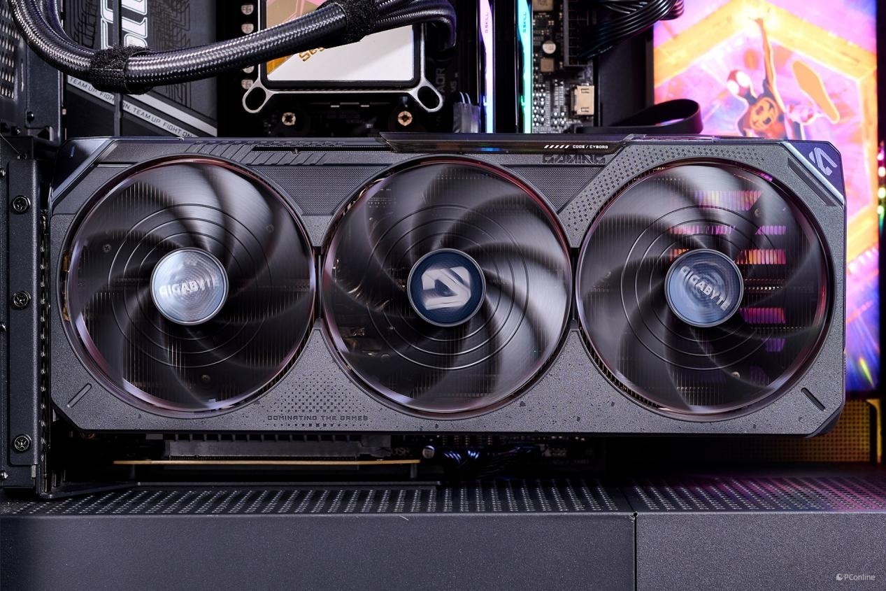 为了降低相邻风扇之间的相互干扰,技嘉RTX 5080魔鹰显卡配备了三把采用正反转设计的风扇,其中央风扇的旋转方向与两侧风扇相反。此外,这三把风扇均支持智能启停技术,在负载较低时能够自动停止转动,从而实现近乎无声的运行体验。