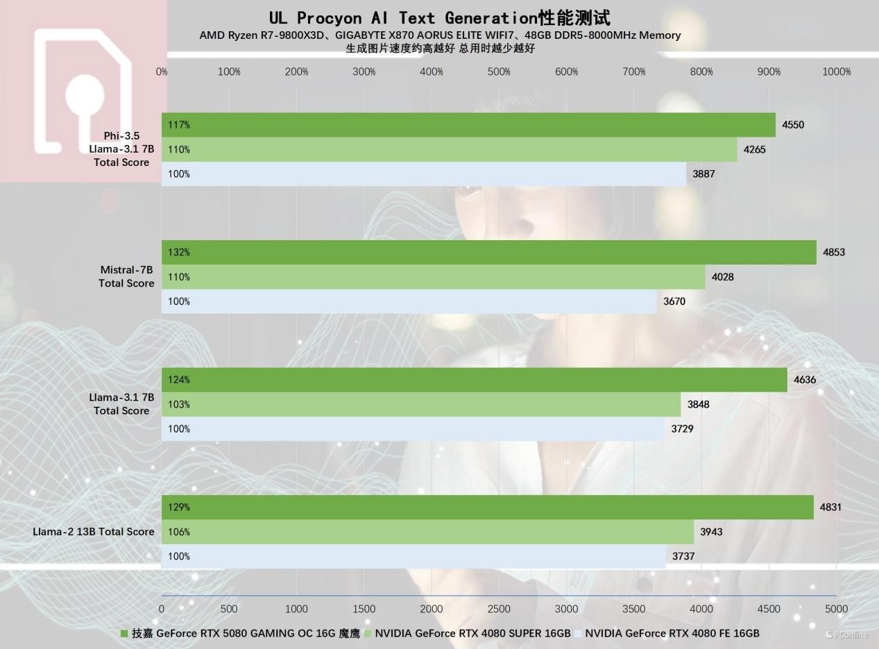 接着我们又用UL Procyon的AI Text Generation测试了更多的大语言模型,技嘉RTX 5080魔鹰显卡的优势依旧十分明显,在以Llama 3.1 7B LLM打造的Phi-3.5测试中,新一代显卡取得4550分的成绩,相比RTX 4080提升了17%,相比RTX 4080 SUPER则提升了7%;将参数扩大至Llama 2 13B的测试中,技嘉RTX 5080魔鹰显卡的表现更加亮眼,4831分的表现已经离RTX 4090不远了,对比性能的话,则可以领先RTX 4080约29%,领先RTX 4080 SUPER 23%以上。