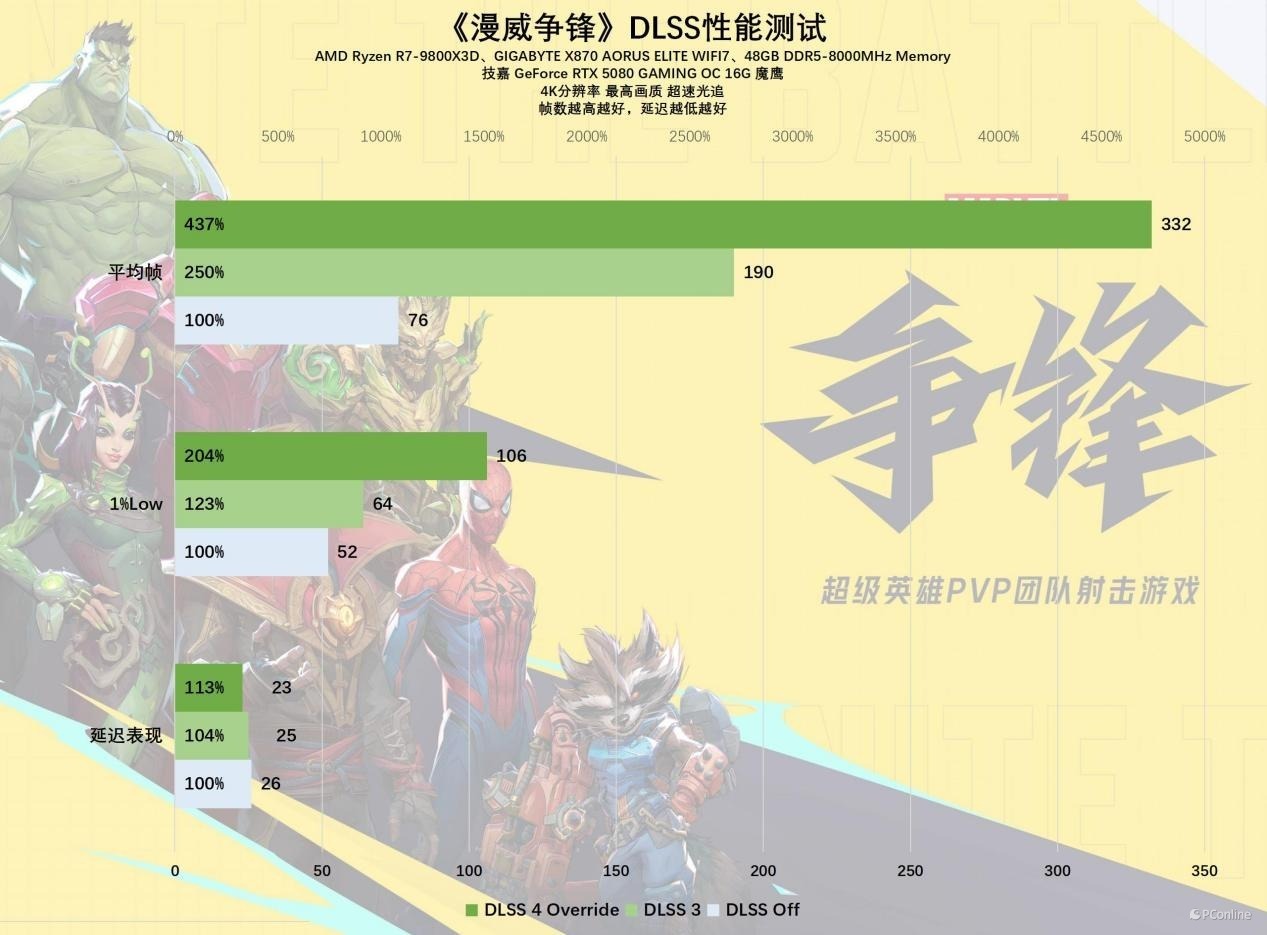 如果你想玩的游戏还不支持DLSS 4,那也不用担心,NVIDIA App还提供DLSS 4 Override功能,说人话就是能够让游戏强开DLSS 4,这里我们以《漫威争锋》为例,在NVIDIA App中简单设置,就能将帧生成调至“4X”,一键实现多帧生成。