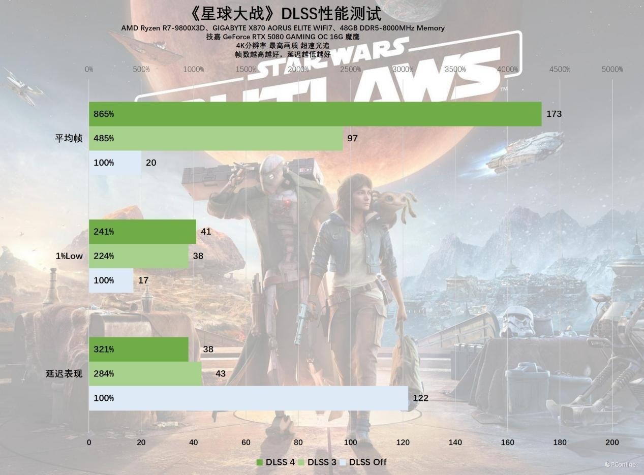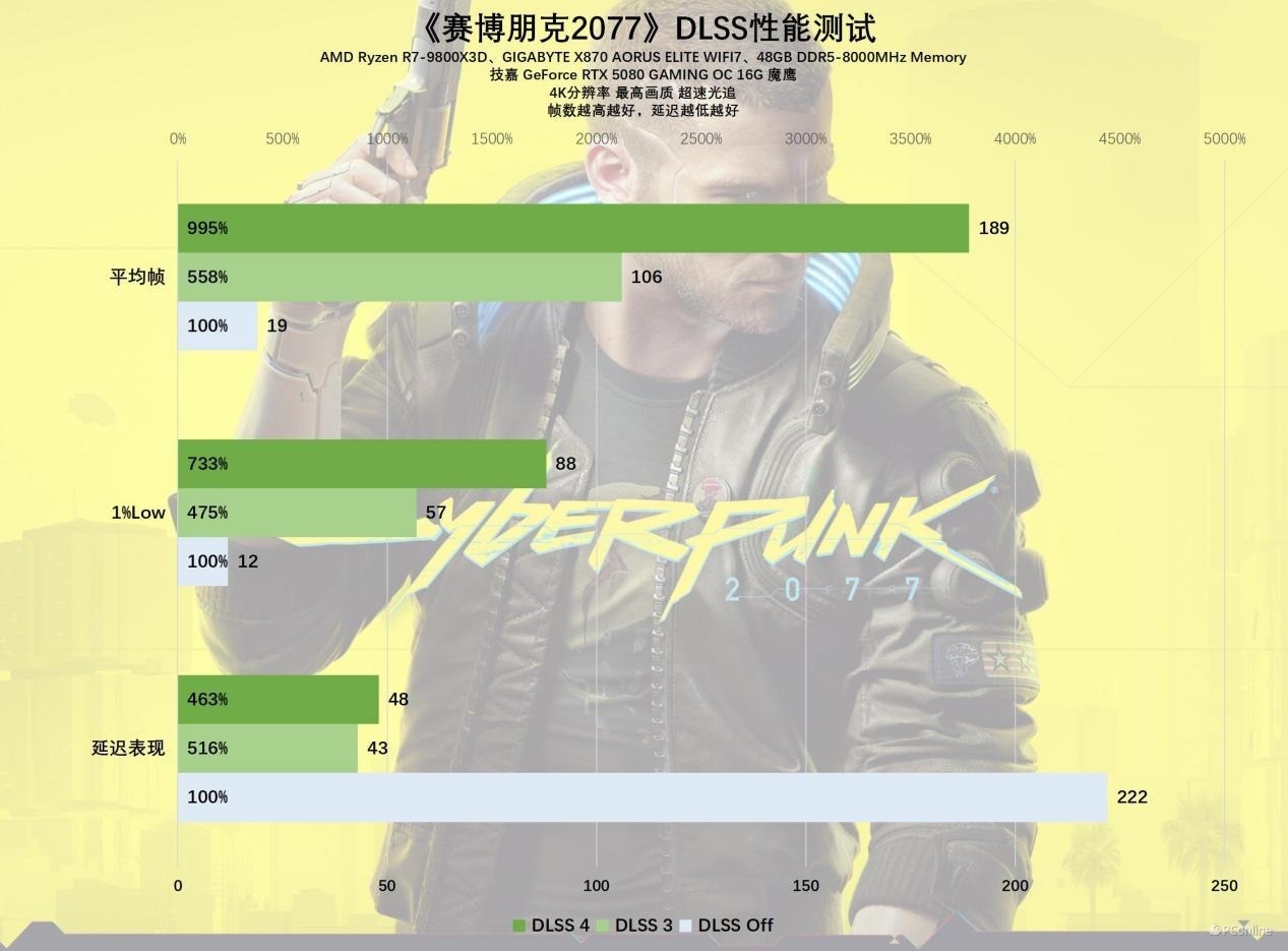在这款游戏中,DLSS 4的实际效果令人印象深刻。在4K原生分辨率下,技嘉RTX 5080魔鹰显卡的平均帧率仅为20 FPS,延迟也高得令人担忧。然而,当启用DLSS 4性能模式后,游戏的平均帧率飙升至173 FPS,游戏体验瞬间变得如丝般顺滑。与原生4K相比,性能提升了大约8.5倍。即便是与DLSS 3的97 FPS相比,性能也几乎翻了一番,这确实是一个令人满意的性能提升。