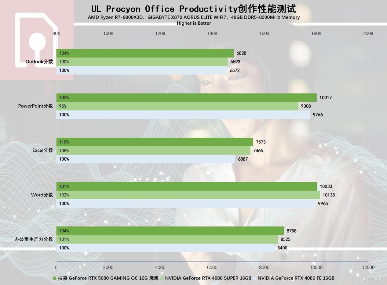 办公软件测试中,技嘉RTX 5080魔鹰显卡表现也不错,整体性能可以领先4%左右,其主要领先在Excel、PPT以及Outlook三项,不过有一说一,这三张卡用来办公只能说确实有些浪费了,用它们打开这些软件,差距应该都是微乎其微的。
