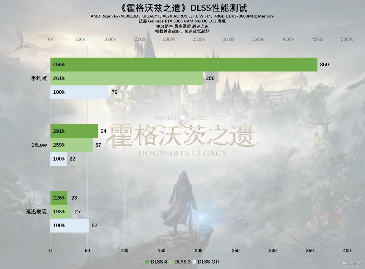 经过体验,《霍格沃兹之遗》这款游戏的优化表现相当出色。在4K分辨率和光线追踪均调至最高设置的情况下,使用技嘉RTX 5080魔鹰显卡,即便不启用任何超采样技术,平均帧率也能达到79 FPS,确保了游戏的流畅运行。当启用DLSS 3性能模式后,帧率进一步提升至206 FPS,游戏体验变得异常流畅。而开启DLSS 4模式时,帧率更是惊人地达到了360 FPS,这已经远远超出了当前大多数显示器的高刷新率范围。与原生4K设置相比,性能提升了超过4.5倍。在实际游戏过程中,无论是1%最低帧率还是延迟表现都相当优秀,特别是延迟,甚至比原生分辨率下还要低,带来了更佳的操控感。