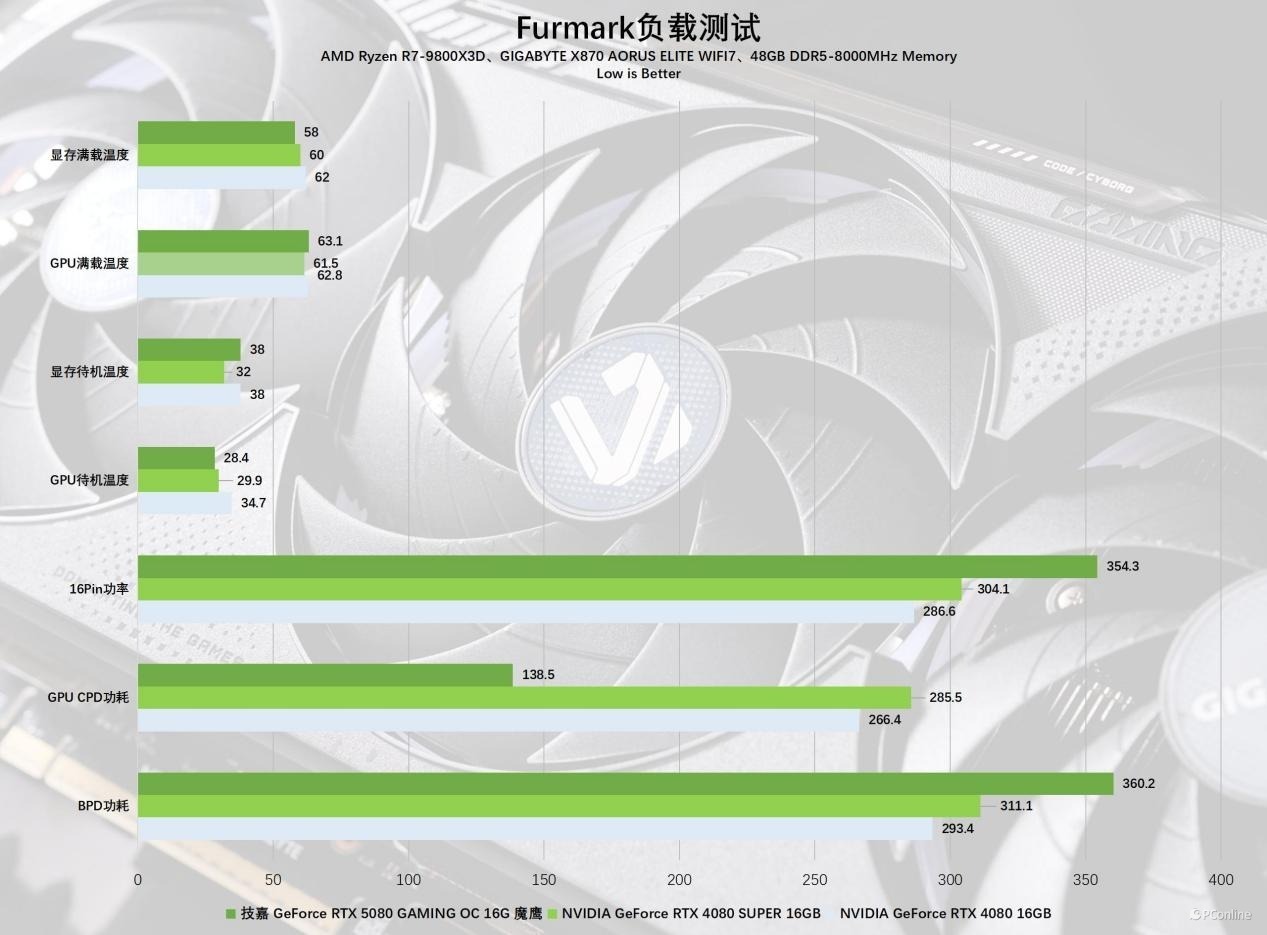 横向对比RTX 4080或RTX 4080 SUPER时可以看到,虽然技嘉RTX 5080魔鹰显卡的TDP提升了,不过整体的烤机功耗并不算高,同时双槽卡在减低了厚度的情况下,核心与显存的温度控制确实不错,属于是非常惊喜了。这对ITX玩家可以说是一大喜讯,现在小主机也能有强性能!