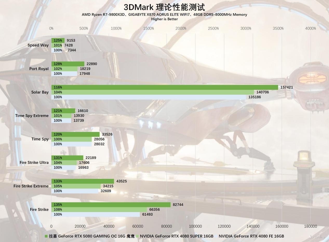 在测试环节,我们首先关注3DMARK的理论性能指标。在FireStrike系列测试中,技嘉RTX 5080魔鹰显卡的表现引人注目,其性能超出RTX 4080 SUPER约27%,与RTX 4080相比,领先优势更是扩大至35%。在以DX12为基准的Time Spy测试中,技嘉RTX 5080魔鹰显卡的得分为33526,相较于RTX 4080 SUPER或RTX 4080显卡,均能保持约20%的领先优势。由此可见,性能的提升是相当显著的。