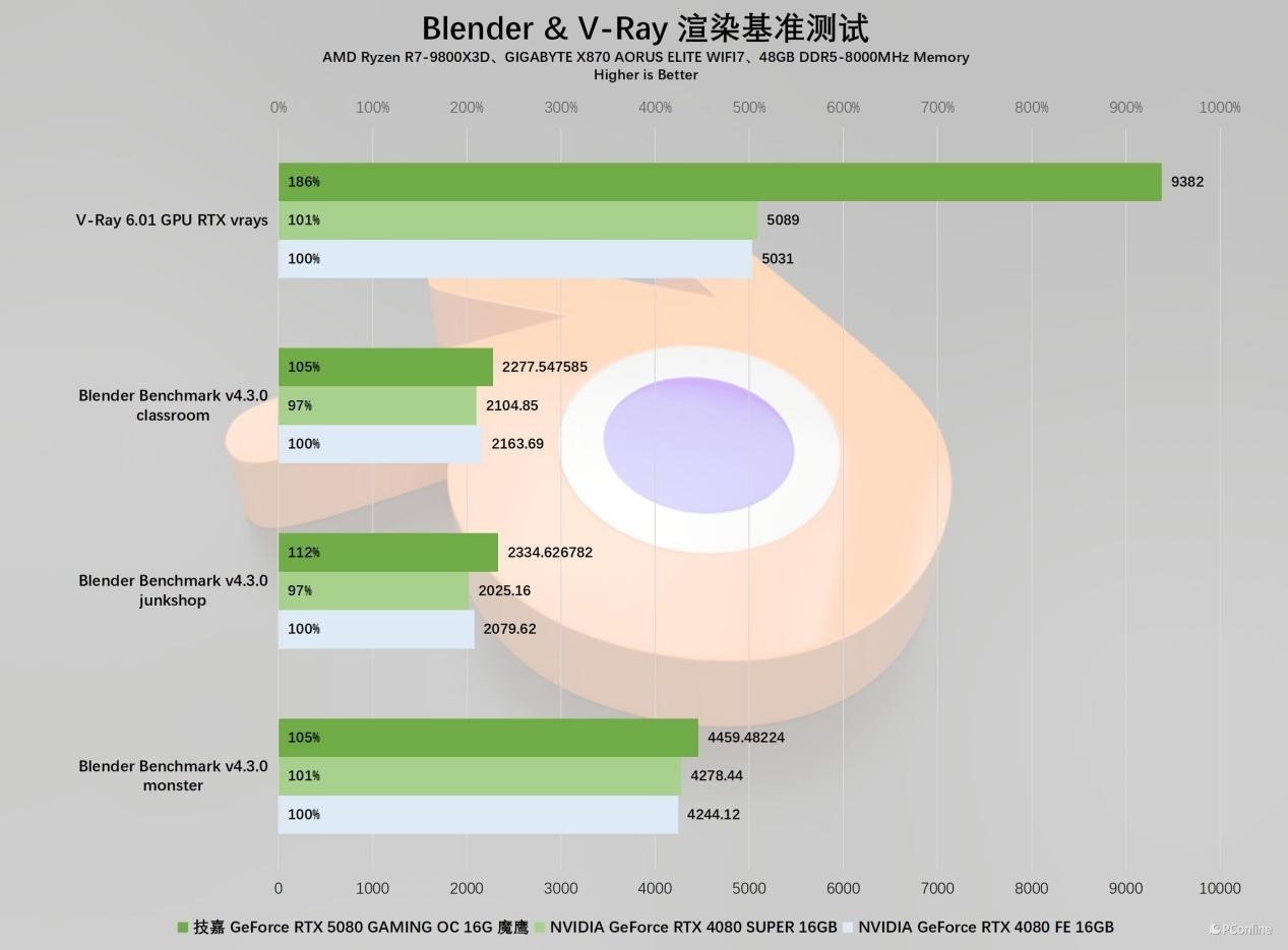 看完了图像视频方面的创作,我们再把目光投向3D渲染以及工业领域的软件中,看看RTX 50系显卡又有怎样的精彩表现。还是熟悉的朋友Blender以及V-Ray,在这两款软件中,技嘉RTX 5080魔鹰显卡的表现也是大杀四方,其中前者基本上能领先RTX 4080 SUPER达5%~12%,而后者就夸张了,对比两张40系卡,甚至可以领先至86%。