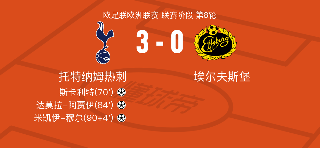 前锋:达莫拉-阿贾伊-7.6、米凯伊-穆尔-7.7、斯卡利特-8.3、里沙利松-7.1、孙兴慜-8.4
