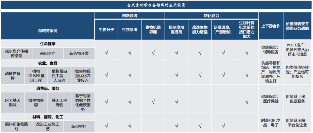 合成生物学将在未来10年内对各个行业产生重要影响。随着合成生物学的应用,医学、美容行业将在5年内迎来一定的产品替代和/或工艺改进,纺织品、食品、农业、化学品等各个行业也都将受到合成生物学技术进步带来的影响。